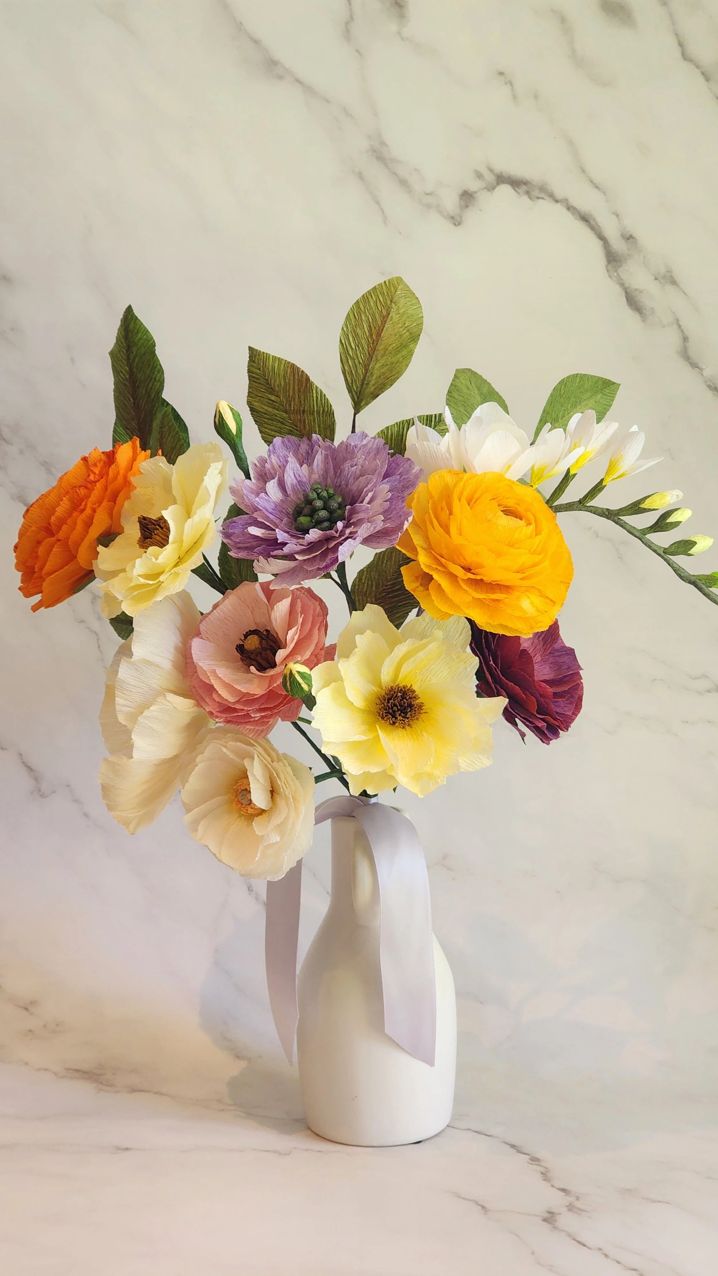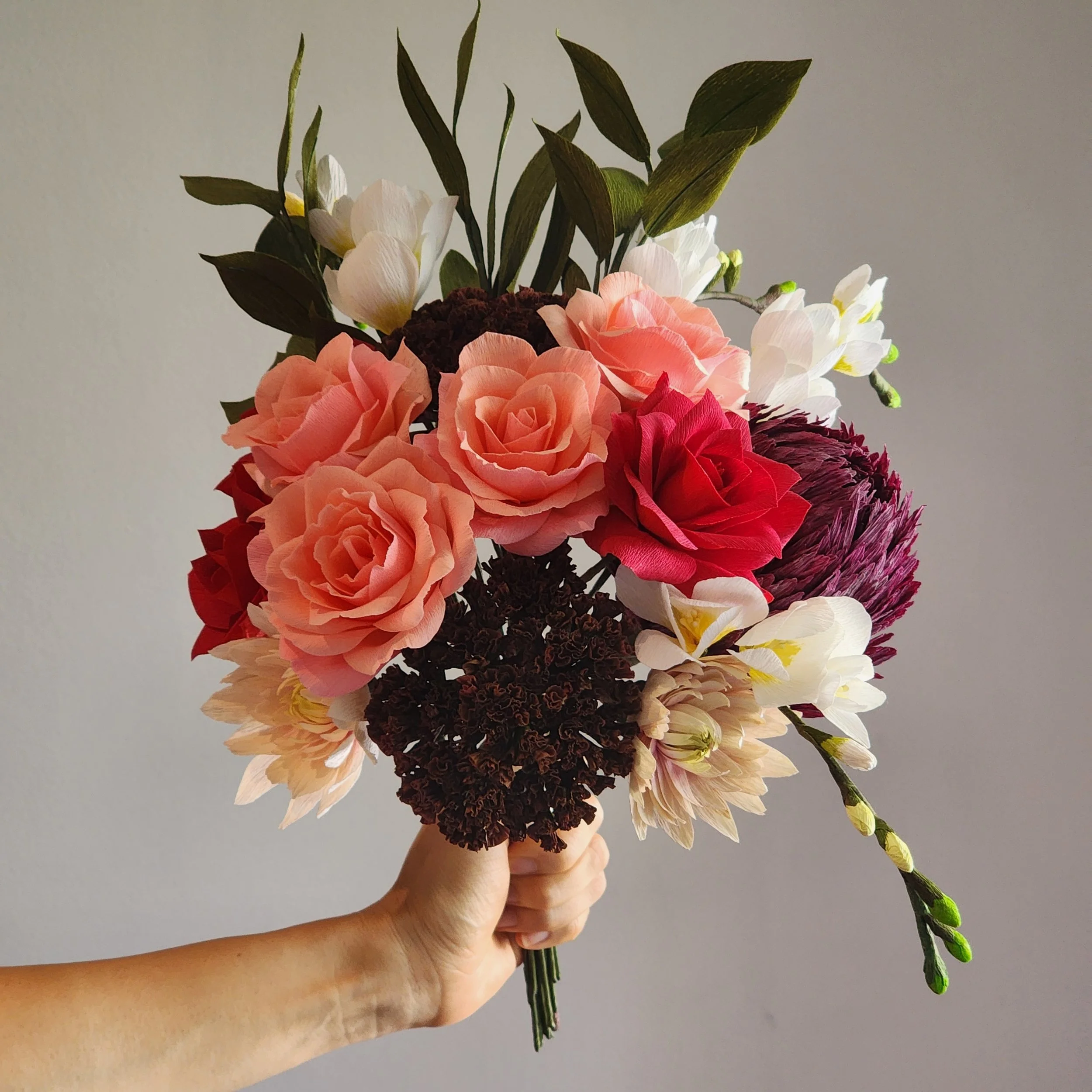A perfect alternative for our customer with hay fever. Crafted meticulously from high-quality crepe paper, these flowers mimic the delicate beauty of real blooms without triggering any allergies. This stunning bouquet is intricately designed to brighten any space with a long-lasting charm. A thoughtful gift for those who appreciate the beauty of flowers sans the sneezes. The wedding guests thought they were fresh flowers.